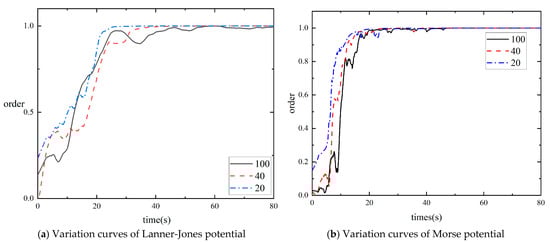 The UAV swarm sizes are set to 20, 40, and 100, and the rest of the parameters are consistent with Experiment 1. We then verify the effect of different swarm sizes on the consistency of UAVs. The time of Morse potential (