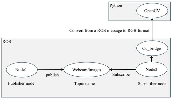 The image processing path obtained with the ROS and Python. Publisher node 1 captures data from a camera sensor and publishes it to the “webcam/images” topic. Subscriber node 2 subscribes to this topic to process the images. CvBridge is an ROS library that serves as an interface between the ROS and OpenCV, enabling image conversion from ROS to RGB.