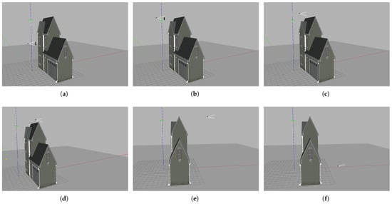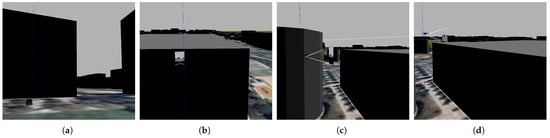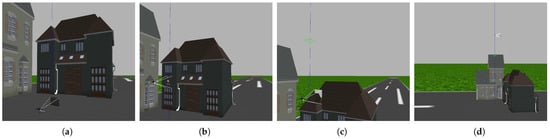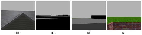 We used many worlds in the Gazebo simulator to collect all image data, as shown in Figure 4 and Figure 5. These figures explain our method for collecting data, where data are collected from different altitudes, at which buildings appear as different shapes. In image (a) of each figure, the drone is hovering at the ground level, displaying the building as an obstacle blocking the drone’s path. In image (b) of each figure, the middle of the building is shown, which still represents an obstacle. In image (c) of each figure, the top of the building is captured, which still represents an obstacle for the drone. In image (d) of each figure, it is clear that the drone has risen above the building; thus, the captured image does not represent an obstacle for the drone.