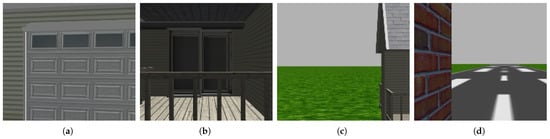 Figure 6 shows the images taken by a drone while hovering close to the ground, where images (a,b) show the obstacles along with the ground, while images (c,d) depict only the ground without obstacles. The drone moves upward to capture the images of the middle of the building in order to show its various forms in the dataset. Images (a,d) in Figure 7 show the middle of the building as an obstacle, while images (c,d) do not. Furthermore, our dataset includes images of the tops of buildings to identify whether the top either does or does not represent an obstacle for drones, as shown in Figure 8, where the tops represent an obstacle in images (a,b), while in images (c,d) the tops do not represent an obstacle.