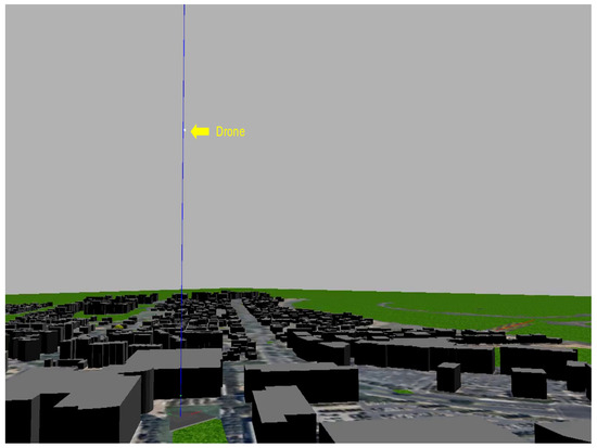 Six experiments were carried out using Algorithm 2 to demonstrate the efficiency of the dataset in maintaining optimal flight altitudes. The tests involved detecting various obstacles at different heights and avoiding them while not flying too high. Figure 19 illustrates the first experiment. The target was placed after the bus to test the database’s ability to detect an obstacle and allow the drone to pass over it to reach the target. In the second experiment, shown in Figure 20, we changed the obstacle to trees and placed the target after the tree. We placed higher obstacles in the third experiment, shown in Figure 21. This building was higher than the bus and trees, and we tested whether the drone could cross the building and reach the target. In the fourth experiment, shown in Figure 22, we increased the distance the drone traveled by increasing the number of buildings in order to test the drone’s ability to cross this distance and reach the target. Figure 23 shows the fifth experiment, which featured a 15-meter-high school. The sixth experiment involved evaluating the drone’s navigation capabilities within an urban environment, as shown in Figure 24.