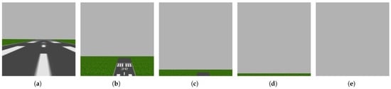 The horizon is half of the scene in image (a), and it expands in the following images until the horizon is the entire scene in image (e). Images (a,b) are labeled with the number 0 to indicate no obstacles for the drone, while images (c–e) are labeled with 2 to signify the horizon.