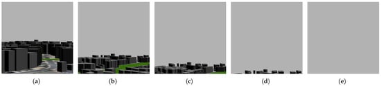 The horizon is an important factor in an autonomous drone flight. If the drone’s altitude varies, then the horizon’s height varies in the scene captured by the drone. The drone must recognize all horizons and ensure that they do not obstruct its flight path. If the drone flies at high altitudes, as shown in Figure 9, then the scene captured by the drone’s camera becomes almost entirely a horizon. The horizon gets bigger as the drone gets higher until the whole scene becomes a horizon. Figure 10 shows the size of the horizon that appears based on the altitude of the drone. In image (a), the land is half of the scene, and the other half is the horizon. In image (b), the horizon is half the scene, and in image (c), it is two-thirds of the scene. The horizon continues to increase until it almost becomes the entire scene in image (d), and it is the entire scene in image (e). In the Gazebo simulator, the KSQL airport was utilized to simulate the city horizon, as shown in Figure 11. Image (a) displays the city with buildings and the horizon, which progressively expands in images (b), (c), and (d), making the buildings appear shorter. By image (e), the entire scene consists of just the horizon. This technique helps to visualize the city’s horizon from inside.