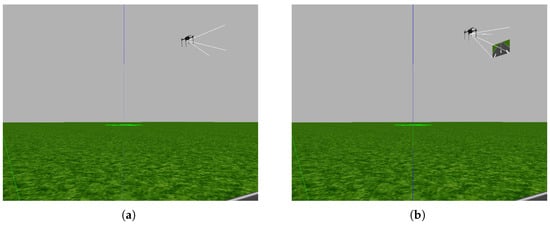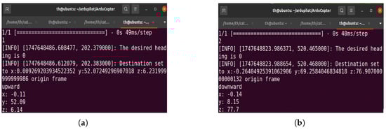 The results of implementation of the algorithms used in our experiments. In image (a), after implementing Algorithm 2, the CNN prediction result is 1, indicating that the CNN detected an obstacle; thus, the drone moved upward. It traveled a distance of y = 52.09 m, and its altitude was z = 6.14 m. In image (b), after implementing Algorithm 3, the CNN prediction result is 2, which means that the CNN detected a horizon, and therefore, the drone moved downward. It traveled a distance of y = 8.15 m, and its altitude was z = 77.7 m.
