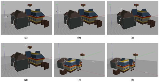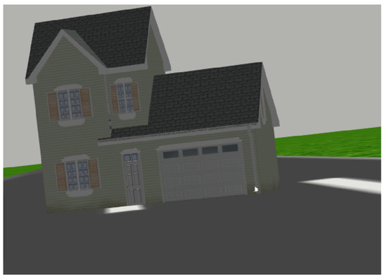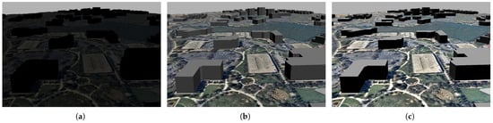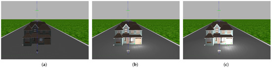 The Gazebo simulator allows users to alter the light in the environment to mimic the real world, allowing for day or night settings and adding spotlights in specific areas to simulate the real world. Figure 14 illustrates the variations in scene light, with image (a) depicting the night, image (b) showing the sun shining, and image (c) showing higher brightness, which allows us to simulate the real world in our database. Figure 15 displays image (a), which lacks brightness; image (b), which has high brightness; and image (c), which is extremely bright and, as such, in which some details of the building are hidden.