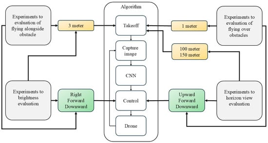 In this section, we describe the evaluation of our dataset using a CNN and a drone, which we used to perform four types of experiments in the Gazebo simulator, as shown in Figure 16. These evaluations include evaluating flying over obstacles, evaluating the horizon view, evaluating flying alongside an obstacle, and evaluating brightness. We explain each evaluation in the corresponding subsection.