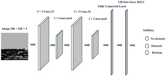 The architecture of the CNN used to classify images into three categories: no-obstacle, obstacle, and horizon.
