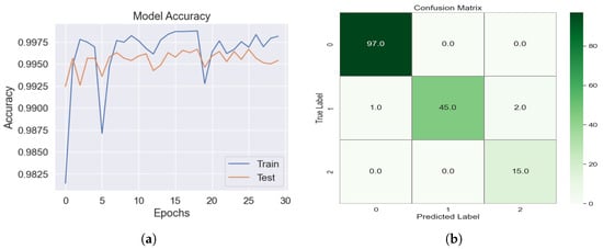 A CNN model was developed to classify images into three categories: non-obstacle, obstacle, or horizon. The drone collected 39,960 images, and the dataset is organized into training, test, and validation sets, with each set containing three categories of images: obstacle images, no obstacle images, and horizon images. Figure 17 shows the CNN designed to classify images into three categories: no-obstacle, obstacle, and horizon. The images, initially captured at 640 × 640 pixels by an RGB camera, were resized to 200 × 200 pixels and normalized to map the pixel value in the range of 0–255 for faster processing. The first convolutional layer used 32 filters of size 3 × 3, followed by max pooling of size 2 × 2 to extract features and reduce the dimensions of the image. This process was repeated before the data were processed through fully connected layers, followed by hidden layers with 128 neurons utilizing the ReLU activation function. The output layer applied the SoftMax activation function for classification. The CNN was trained for 30 epochs, and the accuracy result was 99%, as shown in Figure 18a. The verification result was 98% using the validation data displayed in the confusion matrix in Figure 18b, where 0 indicates no obstacles, 1 indicates obstacles, and 2 indicates the horizon.
