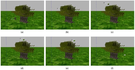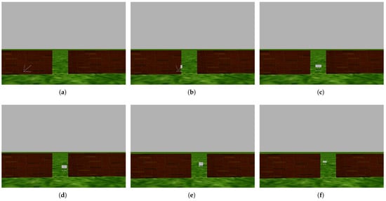The tenth experiment: The drone successfully avoids collisions with obstacles by flying alongside them and passing through a narrow gap. In images (a,b), the drone detects the obstacle and turns right. In image (c), the drone detects that there is a narrow gap through which it can pass. In images (d,e), the drone passes through the narrow gap to reach the target. In image (f), the drone reaches the target, which is 15 m away from the launch point.
