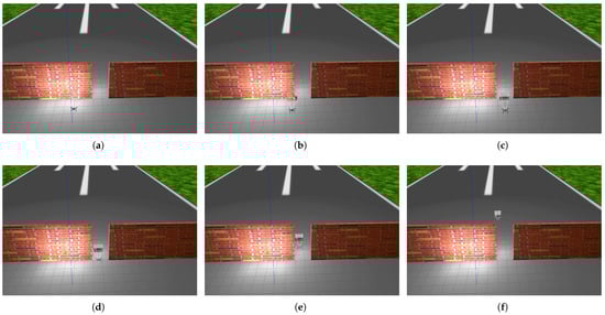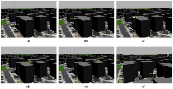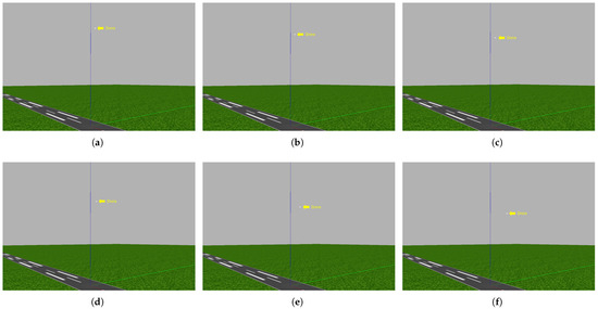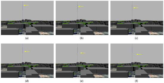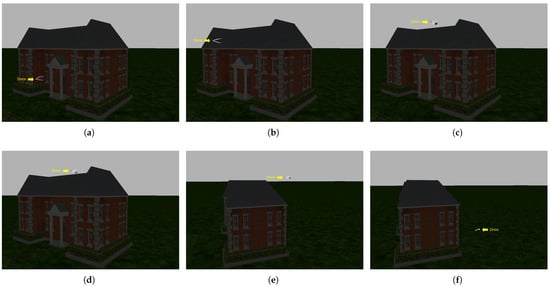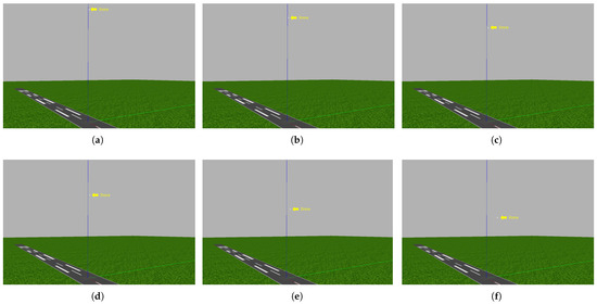 Figure 25 shows the implementation of the seventh experiment. Image (a) shows the start of the experiment, with the drone at an altitude of 100 m. The drone did not start heading toward the target but instead started lowering its altitude because it realized that it was at a high altitude, as shown in images (b–d). When it reached an altitude of 76 m, it started heading toward the target, as it realized through the trained CNN model that it had reached a suitable altitude, as shown in image (e). It subsequently reached the target at an altitude of 67 m, as shown in image (f). Moreover, the trained CNN model lowered the drone’s altitude from 100 m to 76 m, as depicted in the eighth experiment shown in Figure 26, which proves the efficacy of our database in recognizing the city horizon. The greatest altitude drop occurred in the ninth experiment, where the drone dropped from an altitude of 150 to 76 m before starting to head toward the target, which was 30 m away, as shown in Figure 27. These three experiments demonstrated the effectiveness of the dataset in training the drones to perceive the horizon, which enables them to perceive the height they have reached and, based on this perception, determine whether they should descend or remain at the same height.