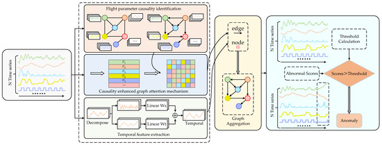 However, these advanced GNN-based methods show obvious limitations when applied to the field of anomaly detection involving complex, multidimensional flight data. The main limitations are as follows: (1) the co-extraction of intrinsic temporal patterns and cross-dimensional spatial features under detection windows remains insufficiently resolved; (2) current architectures predominantly emphasize statistical correlations among flight data across dimensions while neglecting deeper causal relationships. These lead to inadequate accuracy and interpretability of state detection models, as well as reduced sensitivity to anomalies. In complex system analysis, causality and statistical correlation are fundamentally distinct [32]. The former reveals the irreversible physical mechanisms of action, whereas the latter merely reflects statistically significant dependencies between parameters. For instance, when a UAV executes a steering flight command, changes occur in the X-axis and Y-axis accelerations. In such cases, the UAV’s flight control system detects these acceleration changes and adjusts the yaw angle to correct the UAV’s heading. Here, the changes in X-axis and Y-axis accelerations serve as the cause, whereas the adjustment of the yaw angle represents the effect in response to these acceleration changes. This actual causality between flight parameters critically influences anomaly propagation. Therefore, incorporating parameter causality into anomaly detection models is essential for achieving more accurate, robust, and interpretable results. Furthermore, UAV flight data exhibit significant multi-source heterogeneity, comprising a mixture of continuous sensor data and actuator control signals. Sensor data typically manifest as high-sample-rate floating-point sequences, while control signals may represent low-frequency Boolean variables. Traditional loss functions may overlook weight differences between diverse data sources and struggle to capture their complex coupling relationships.