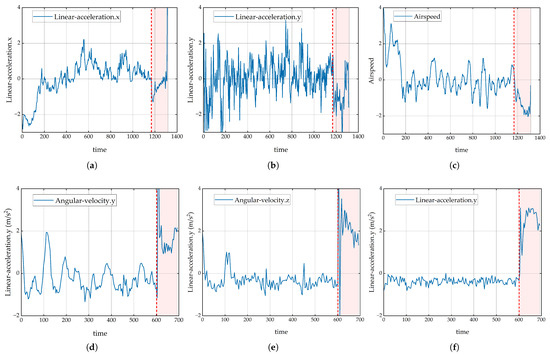 Figure 3 illustrates significant changes in some of the flight parameters when a UAV engine failure occurs or when the rudder becomes stuck to the left, showing a strong correlation between these parameters and the UAV anomaly. The red dashed line marks the moment of engine failure, while the pink area indicates the flight time after the anomaly occurred. Specifically, the linear accelerations in the X- and Y-axes exhibit significant fluctuations after engine failure, especially after the red dashed line, indicating that the UAV’s speed in the X- and Y-axis directions becomes unstable after engine failure. Concurrently, the airspeed also shows significant changes with a sharp decrease, which is typically associated with a reduction or complete loss of engine thrust. Additionally, when the rudder becomes stuck to the left, certain parameters also change significantly after the failure. The acceleration characteristics show significant fluctuations after failure, especially after the red dashed line, with a significant increase in fluctuations, suggesting that the acceleration in these directions changed drastically after the rudder deviation. The abrupt acceleration changes similarly result in sharp velocity fluctuations, further demonstrating the UAV’s velocity instability following rudder deviation.