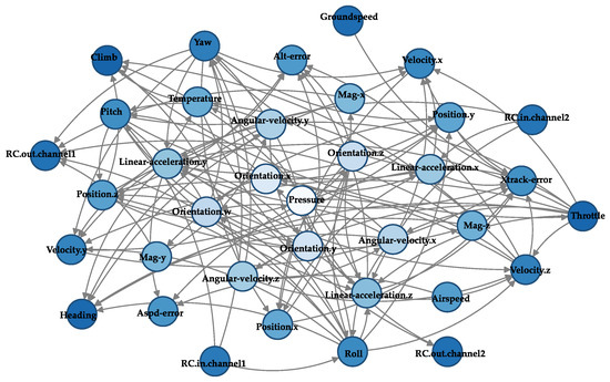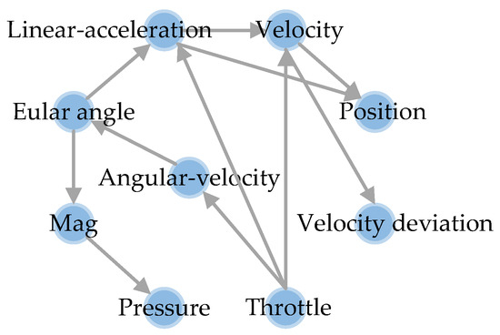 The causal network provides a visual depiction of the causal matrix, as shown in Figure 2. In the network, the nodes correspond to the flight parameters, and the directed edges indicate the causality between these parameters. The values of the elements in the matrix correspond to the presence or absence of causality between the nodes in the network.