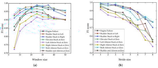 The impact of different window sizes and step sizes on F1 score. (a) Window size; (b) stride size.