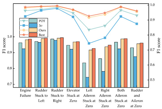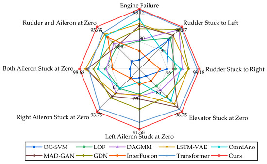After ten rounds of experiments, the average Precision, Recall, and F1 score are evaluated on different types of anomalies. A performance comparison among different algorithms is shown in Table 3. The proposed method achieves the highest F1 score on multiple types, demonstrating its superior balance between Precision and Recall. This balanced performance is particularly critical for effective UAV anomaly detection. In addition, our method exhibits the most satisfactory results on left- and right-aileron anomalies, which suggests that there is a low likelihood of generating false detections on these two error types.