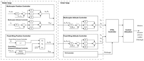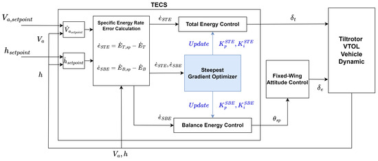 To mitigate the limitations of static TECS gains in addressing the nonlinear dynamics of tilt-rotor eVTOLs during the post-transition phase, this study proposes a real-time gain-tuning methodology employing the steepest descent method. The proposed approach dynamically adjusts the proportional gains () and integral gains () of TECS based on critical flight states—such as altitude error, airspeed deviation, and pitch rate, which directly influence the pitch instability observed during transitions—thereby minimizing altitude loss and substantially enhancing stability immediately following the transition to fixed-wing mode and providing a resource-efficient solution for open-source autopilot systems. The overall control structure, inspired by Ahn and Thanh [11], is depicted in Figure 4.