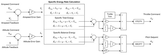 TECS, introduced by Lambregts [6], regulates aircraft airspeed and altitude by manipulating throttle and pitch to control kinetic and potential energy. The total and balanced energy rates are defined as
