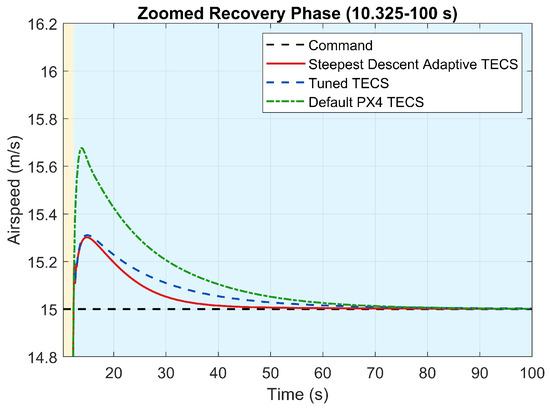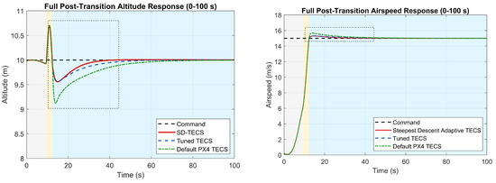 As demonstrated in Section 6.6, SD-TECS reduces the altitude integral error by 66.1% and the airspeed settling time by 57.3% compared to the standard PX4 TECS, confirming its technical advantage in energy regulation and post-transition stability.
