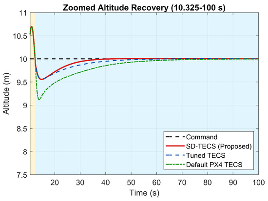 Performance was evaluated using key metrics: settling time, maximum altitude loss, and integration of errors for both altitude and airspeed. Table 4 presents the comparison results between the three TECS variants—PX4 default, tuned TECS, and the proposed SD-TECS—based on a 3% tolerance range around the target altitude (10 m) and airspeed (15 m/s). SD-TECS demonstrated the fastest response, reducing the altitude settling time to 28.56 s, a 35.5% improvement over the PX4 default (44.31 s) and 20.3% over the tuned TECS (35.31 s). The airspeed settled at 23.14 s for SD-TECS, outperforming the PX4 default (40.20 s) by 48.9% and the tuned TECS (26.75 s) by 13.5%. In terms of overshoot, SD-TECS minimized the maximum altitude loss to 0.83 m, representing a 42.4% improvement over the PX4 default and a 4.8% improvement over the tuned TECS. The airspeed overshoot was also the lowest at 0.61 m/s, showing a 48.9% reduction compared to the PX4 default (1.16 m/s). Additionally, SD-TECS achieved the smallest integration of errors: 12.78 m2 for altitude and 148.02 m·s for airspeed, representing 66.1% and 12.0% improvements over the PX4 default, respectively. Overall, SD-TECS consistently outperformed both baseline methods, demonstrating superior control accuracy, energy efficiency, and adaptability in dynamic post-transition flight scenarios.
