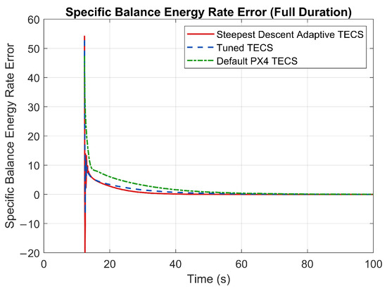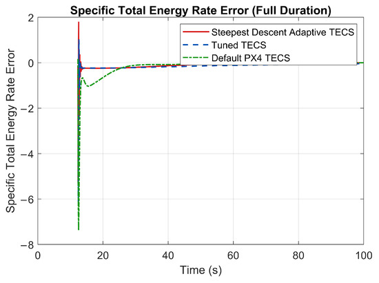 Figure 10 and Figure 11 illustrate the responses of the specific total energy rate (STE) and the specific balanced energy rate (SBE) errors post-transition. SD-TECS achieved a significantly faster reduction in both energy errors than the PX4 TECS with default and tuned gains, leading to quicker stabilization of the altitude and airspeed. The rapid reduction in the energy-rate errors highlights SD-TECS’s superior ability to adapt to the nonlinear dynamics of the transition phase, ensuring smoother and more stable flight performance by effectively compensating for the limitations of other TECS variants in managing energy errors during the post-transition phase.