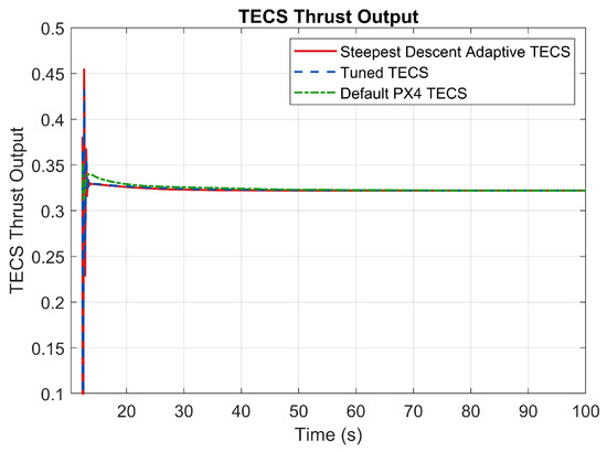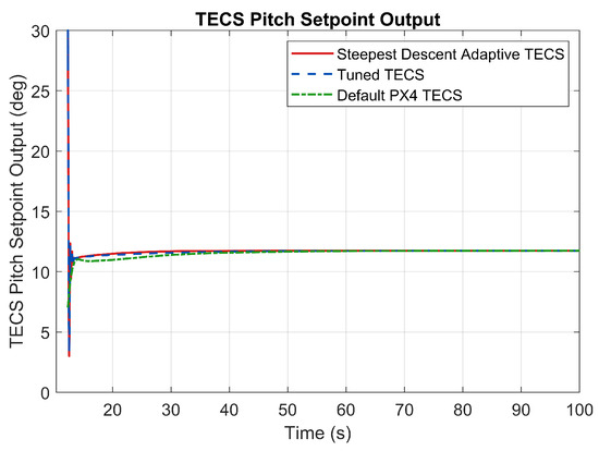 Figure 12 and Figure 13 illustrate the thrust and pitch outputs for the different TECS variants. SD-TECS dynamically adjusted these control outputs more effectively than the other methods, contributing significantly to the enhanced stability during the post-transition phase, as its ability to adaptively modify thrust and pitch ensured smoother flight control, thereby minimizing oscillations and improving overall aircraft response, particularly during the post-transition phase with nonlinear dynamics, where other methods may struggle to stabilize the aircraft quickly.