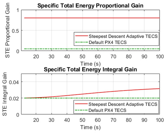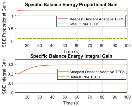 Figure 14 and Figure 15 show the real-time adjustment of the proportional and integral gains for the STE and SBE loops in SD-TECS, enabled by the steepest descent method. This dynamic gain tuning allowed SD-TECS to quickly adapt to changes in the altitude and energy errors, ensuring stability and smooth performance during the post-transition phase, in contrast with the tuned TECS, which relied on fixed, pre-calibrated gains that did not adjust in real time. While the proportional gains remained stable in both methods, SD-TECS dynamically adjusted the integral gains, enabling faster stabilization of the altitude and airspeed, thus enhancing its ability to handle the nonlinear dynamics of the post-transition phase, whereas the tuned TECS lacked flexibility and relied on static values.