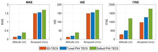 As shown in Figure 16, the SD-TECS consistently yielded the lowest errors across all metrics for both altitude and airspeed control. Notably, it reduced the altitude IAE and ITAE by more than 65% and 75%, respectively, compared to the PX4 default controller.