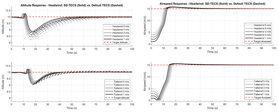 Section 6.6 demonstrated SD-TECS’s superior performance under baseline conditions, where it achieved faster convergence and reduced errors compared to the PX4 default. To further evaluate its applicability in real-world scenarios, this section examines the robustness of SD-TECS to environmental wind disturbances. A linear wind model was chosen to focus on longitudinal dynamics, which act as the primary disturbance in the post-transition phase for tilt-rotor eVTOLs, particularly in urban air mobility contexts where stable flight under varying wind conditions is essential. Specifically, we introduced wind speeds ranging from 0 m/s to 5 m/s, considering headwind (0 degrees) and tailwind (180 degrees) directions in the body frame. Figure 17 illustrates the altitude and airspeed responses under headwind and tailwind conditions for both SD-TECS and the PX4 default. The target altitude (10 m) and airspeed (15 m/s) are indicated with red dashed lines to highlight the desired setpoints. The line intensity in the figures reflects the wind speed, with 0 m/s represented by the darkest shade (black) and 5 m/s by the lightest shade (gray), providing a clear visual distinction of wind speed effects. As illustrated, SD-TECS demonstrated superior stability and control precision compared to the PX4 default across all tested wind conditions, achieving faster convergence to the target values with reduced oscillations. This enhanced performance is attributed to SD-TECS’s adaptive gain tuning, which enables more responsive and precise control compared to the fixed-gain approach of the PX4 default, as discussed further in Section 7.