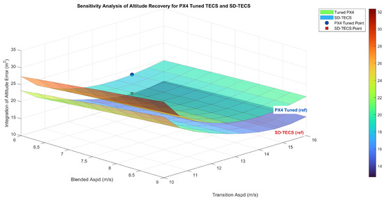 Figure 18 evaluates the adaptability of SD-TECS to various flight conditions by analyzing its performance under different transition parameter settings. Specifically, BLENDED_ASPD and TRANSITION_ASPD were varied in the ranges of 6–9 m/s and 10–16 m/s, respectively, while keeping other PX4 parameters constant. The tilt rate was also tested, but its influence on transition behavior was found to be negligible, so it was excluded to focus on the two most influential parameters affecting fixed-wing engagement and energy-control dynamics. The surface plot compares the integration of altitude error for both the tuned TECS and the proposed SD-TECS across all parameter combinations, with the experimental reference point used in the performance analysis (i.e., BLENDED_ASPD = 6, TRANSITION_ASPD = 15) marked explicitly on the surface, highlighting that SD-TECS achieved superior performance under this condition and maintained a consistently lower altitude error across the tested parameter ranges, demonstrating that it is not only effective under nominal conditions but also adaptable to parameter variations, thereby making it a reliable option for real-world VTOL operations.