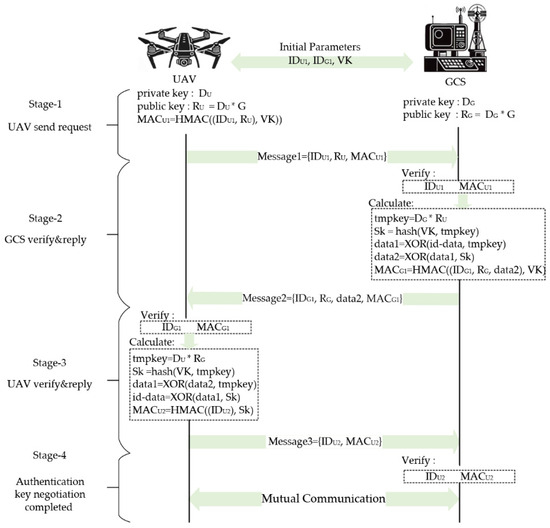 The rapid development of Internet of Things (IoT) technology has propelled the widespread use of unmanned aerial vehicles (UAVs), demonstrating significant application potential across multiple industrial sectors, including but not limited to power transmission line inspection, emergency rescue operations, and intelligent logistics management [1,2,3,4]. However, the security of communication channels between UAVs and ground control stations (GCSs) has emerged as a critical issue requiring urgent attention. UAVs in an unsecure communication environment face risks like signal jamming, GPS spoofing, and man-in-the-middle attacks, leading to hijacking, crashes, or data interception. Transmitting sensitive data over unencrypted channels risks exposure to cyber espionage or sabotage. In military operations, unsecure communication can jeopardize missions, endanger personnel, or lead to strategic information being leaked. In civilian use, communication insecurity may cause accidents, financial losses, or delayed aid. Among these challenges, effective mutual authentication mechanisms for mutual communication and secure message transmission protocols constitute essential prerequisites for ensuring mission-critical operations.