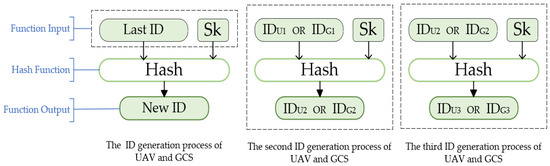 Static identifiers are transmitted directly over an open network in clear text, making it easy for attackers to forge legitimate identities. Therefore, the GCS combines the session key () with the original static identity (,) and generates the updated mutual identity for identity authentication, combining the new identity data of both sides into . Based on the consideration of limited UAV resources, the calculation of identity information is completed by the GCS alone, and the UAV is only responsible for receiving and using it. A more detailed identity generation process is described in the next section.