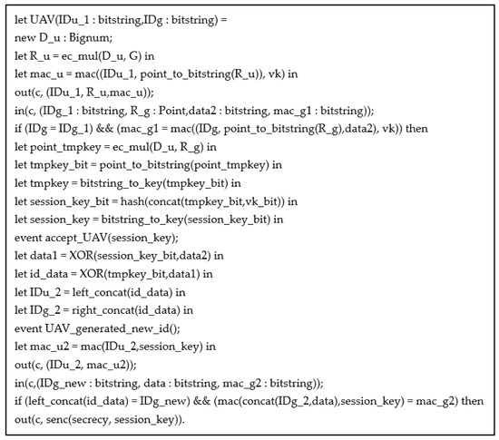 Figure 5 shows the detailed code implementation process of communication between the UAV and GCS, which is similar to the corresponding process on the GCS side. In the local environment at the initial stage, UAV pre-generates the temporary key parameters such as and and the authentication code and then sends them to the GCS. After receiving the reply message from the GCS, UAV first verifies that this identity is the same as its own locally saved identity of the GCS and that the is consistent with its own computed value. It is determined through the if-condition statement that both of these conditions must be met before the next step of temporary key negotiation can be carried out. After that, the UAV uses the received temporary GCS key parameter to generate the corresponding and . As with the GCS side, the UAV will trigger the event corresponding to line 13, which is specifically expressed as “event accept_UAV(session_key)”. Through two XOR operations, when the UAV receives the new identity sent by the real GCS, it will also trigger the second event, as in line 18, which is specifically expressed as “event UAV_generated_new_id()”. Only when the UAV and the GCS successfully complete the initial two-way identity authentication process in accordance with the protocol process can the UAV successfully receive the new identity parameters and complete the update of its own and the GCS’s identity parameters through the dynamic identity update process described earlier. Finally, the received new identity is used to send a reply message to the GCS, and is used to encrypt and decrypt the message.