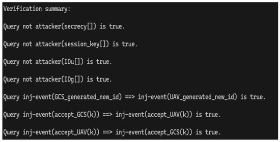 The first two queries focus on confidentiality during the communication. Specifically, the query commands “query attacker(secrecy)” and “query attacker(session_key)” check whether an attacker can gain access to the private information or session key . Following this, the next two query commands, “query attacker(IDu)” and “query attacker(IDg)”, assess whether the attacker can steal the real identities before initiating the communication process and whether there is any vulnerability that allows an attacker to impersonate either the GCS or UAV, thus breaking the authentication process.