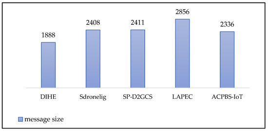 As can be seen in Figure 7, the messages sent during the communication protocol of the DIHE designed in this paper occupy less memory space. The results regarding the communication overheads of the relevant comparative schemes, that is, the specific message size, can be obtained from the experimental conclusion sections of the corresponding studies [18,19,20,21].