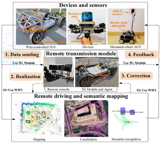 Remote interaction is commonly utilized in various fields, including engineering plants and augmented reality. In the case of engineering plants, remote interaction is primarily used to ensure the safety of operators’ lives, as seen in mine excavation and remote driving, where the working conditions are unsuitable for prolonged human presence. On the other hand, remote interaction in augmented reality [27] is mainly focused on user–oriented behavioral interactions that enable human interaction from any location. Previous studies have explored data transmission in large–scale scenarios using socket programs and cloud servers, as seen in the literature [28]. However, these studies were largely limited to single–agent or UAV–only communication, lacking integration with heterogeneous agents like UGVs. For instance, research on 5G–enabled remote driving [22] highlighted transmission interference challenges but primarily focused on standalone vehicle control. Another study [29] investigated multi–user augmented reality via visual SLAM sharing yet omitted dynamic environment adaptation, which is critical for UAV–UGV collaboration. Our work bridges this gap by enabling seamless communication between mixed agents with semantic-aware data fusion.