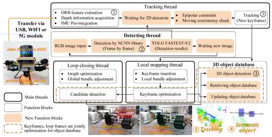 System pipeline integrating visual–inertial SLAM and semantic detection.