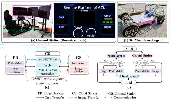 Physical configuration (a,b) and remote interaction workflow (c,d): (a) ground station (GS) interface showing real-time image window for video streaming and control panels; (b) edge device (ED) equipped with 5G module for wireless communication; (c) workflow diagram: 1. Image capture by EDs; 2. WebRTC channel generation for peer-to-peer video streaming; 3. Data matching to synchronize video frames with telemetry; 4. Interaction via GS command input. Arrows denote data flow: solid lines for video/control signals, dashed lines for semantic map updates.
