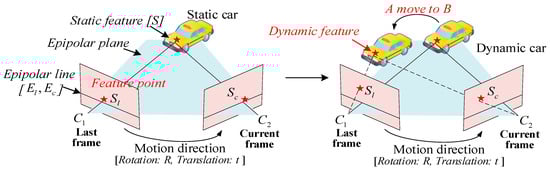 : the position of the feature point in the pixel coordinate system. Then, the fundamental matrix can determine the epipolar line in the current frame. For static points, must lie on the epipolar line in the current frame.