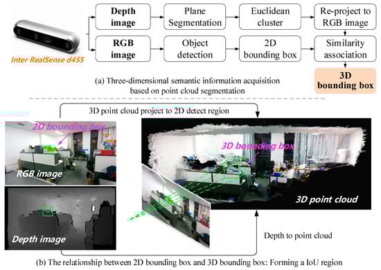 Furthermore, Equation (6) is substituted into the vector to obtain the projection result of the camera plane. Finally, the interSec between the boundary of the projected image and the bounding box coordinates of object detection is calculated to obtain more accurate boundary information in a 3D space. In this study, semantic information and multi-view geometry assumptions are combined, i.e., if projection and detection regions belong to the same object, these two sets of regions should overlap. Therefore, the InterSec over Union (IoU) is calculated to represent the degree of overlap, as shown in Equation (7).