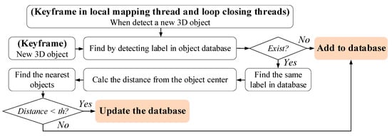 The criteria for constructing the object database are as follows: (i) For objects with the same label appearing in consecutive keyframes, we judge whether the Euclidean distance of the mass center is less than th; (ii) If the center distance of the same object is greater than the object size, this is a different object with the same label, and the object ID is recorded; (iii) When constructing the public database from multi-view, mislabels based on the number of the same object are removed; (iv) When loop detection occurs for objects with the same label to optimize the spatial location, the steps (i), (ii), (iii), and (iv) are duplicated.