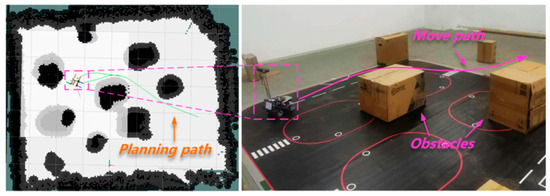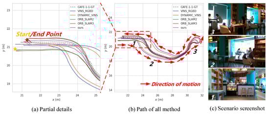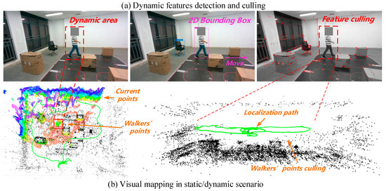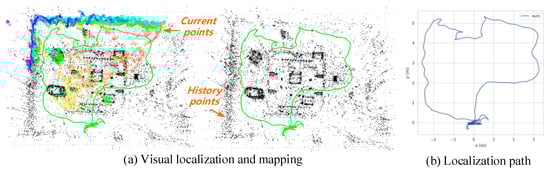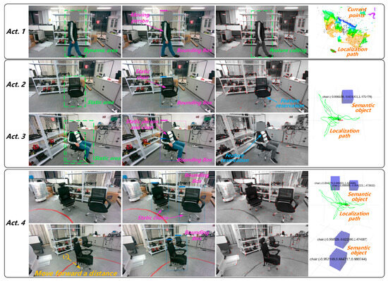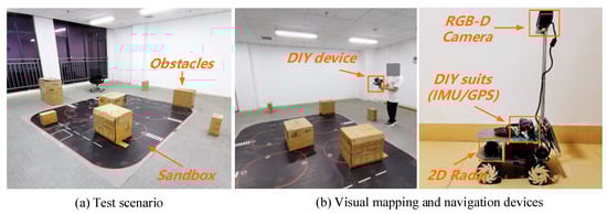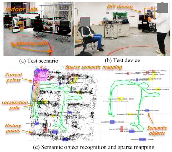 In Figure 17a, we present an indoor scenario where we introduced a sandbox and placed static obstacles such as boxes and chairs. Our system performs two tasks in this scenario. Firstly, it constructs a visual map and removes the walker’s points. Secondly, an AGV moves across the visual semantic map to achieve localization and navigation in an unknown environment. The two principal metrics to evaluate the performance of this step are localization accuracy in a dynamic environment and the availability of the semantic visual map.