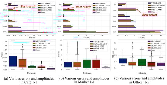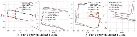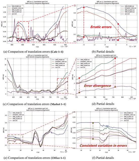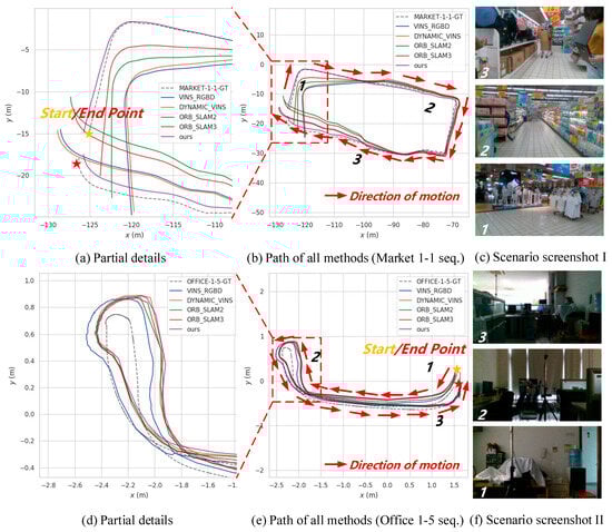 Results Analysis: While our method generally outperformed baselines in dynamic scenarios, an exception occurred in Market 1–2, where it exhibited the highest RMSE (2.1437 m) among the compared approaches (Table 6). This degradation is hypothesized to arise from three interrelated factors, as follows. (1) High dynamic object density and occlusion: The sequence involves dense traffic with frequent occlusions, leading to partial bounding box mismatches during YOLO–FASTEST detection. Specifically, overlapping objects caused incomplete dynamic region masking, leaving residual motion features in static background regions. (2) Illumination fluctuations and sensor noise: Rapid changes in sunlight intensity induced temporary depth sensor noise, reducing the accuracy of optical flow estimates used in epipolar constraint checks. Noisy flow vectors increased false positives in dynamic feature validation, retaining some moving points as static. (3) Scale variability and loop closure delay: The sequence’s large trajectory (215 m) and lack of distinct semantic landmarks delayed loop closure, causing cumulative drift. Unlike ORB–SLAM3, which relies on geometric features for loop detection, our semantic-aware approach prioritized dynamic feature rejection over aggressive loop closure, exacerbating scale errors in feature-sparse segments, as shown in Figure 7.
