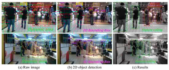 The following experimental parameters and optimizations were applied: (1) Input image resolution (Jetson Nano: 416 × 416 pixels to balance detection speed (38 FPS) and object localization accuracy; Jetson AGX Xavier: 608 × 608 pixels, enabling 75 FPS while retaining fine-grained features for small object detection); (2) batch size (batch size = 1 for both platforms, as real-time robotic applications require per-frame processing rather than batched inference. This avoids pipeline stalls and ensures temporal consistency in dynamic feature tracking); (3) NCNN specific optimizations (model quantization: converted 32-bit floating–point weights to 8-bit integers, reducing memory access latency by 40% and GPU bandwidth usage by 75%; layer fusion: merged consecutive convolutional-batchnorm-relu layers into single kernels, decreasing computational graph complexity by 28%; multi-thread parallelism: utilized NCNN’s built-in CPU multi-threading and GPU acceleration (CUDA backend for Xavier only), achieving 2.3 speedup over single-threaded inference; (4) Hardware configuration (Jetson Nano: 1.43 GHz Quad-core ARM Cortex-A57, 4 GB LPDDR4, integrated NVIDIA Maxwell GPU; Jetson AGX Xavier: 3.3 GHz Hexa-core Carmel ARM, 8 GB HBM2, NVIDIA Volta GPU). These parameters demonstrate how resolution and optimization trade-offs enable real-time performance across heterogeneous edge devices.