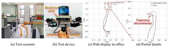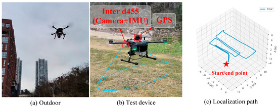 Scenario 4: As shown in Figure 22a,b, the environment is an outdoor setting for UAV tilted photography. As our focus is on UAVs, the performance of system needs to be evaluated from outdoor and aerial perspectives. The experimental setup consists of a self-assembled system on board the UAV, which includes the NVIDIA Jetson TX2 processor, Intel RealSense D455 camera, and u–blox GPS module. The image, location, and detection information are transmitted to the ground station via Wi–Fi communication. The task of the UAV is to perform dynamic feature removal and visual map construction while in motion. To ensure experimental safety, as shown in Figure 22c, the UAV is placed in an outdoor unstructured environment and follows a predefined zigzag path. The flight height is set at approximately 8 m to verify whether dynamic feature recognition and elimination can be achieved under effective detection conditions. Additionally, it allows for the evaluation of system performance and robustness under real-world flight circumstances. The UAV communicates with the ground station via a 5G module, enabling real-time video streaming of dynamic scenes and low latency telemetry for pose updates. This allows operators to visually monitor obstacles (Figure 23b,c) and send control commands without delay, which is critical for adaptive path planning during flight.