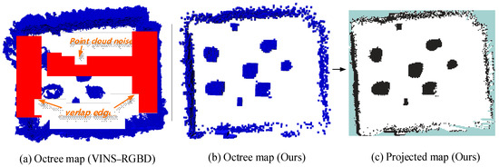 Three-dimensional navigation map of VINS–RGBD and ours (octomap (a,b), projected map (c)).