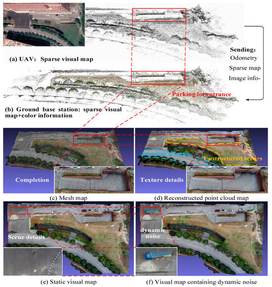 In this scenario, the UAV ascends from the starting point and flies along a predefined trajectory. During the flight, the camera’s field of view captures moving pedestrians. To observe the impact of dynamic scenes on visual localization and mapping, the UAV hovers in place and continues to observe, as shown in Figure 23a.