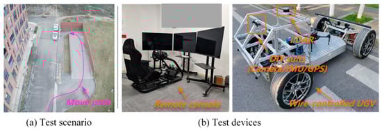 Scenario 6: Building on the dual-channel architecture validated in Scenarios 1–4, Scenario 6 extends the framework to UGV remote driving in mixed indoor–outdoor environments, directly leveraging the same WebRTC–MQTT communication stack and YOLO-FASTEST detection pipeline. Like the UAV navigation in Scenario 4, the UGV utilizes edge devices for on-board SLAM, with 5G providing long-range connectivity and Wi-Fi enabling stable control in signal-constrained indoor areas. This scenario reuses the semantic object database from Scenario 2, where static chair models and dynamic pedestrian features were first validated, ensuring consistent object labeling across heterogeneous agents. The latency compensation strategy also carries over, with IMU–based pose extrapolation maintaining spatial consistency during the 230 ms delay spike in underground segments, mirroring the temporal synchronization techniques used in the UAV’s dynamic feature rejection. The experimental setup and devices used are depicted in Figure 25.