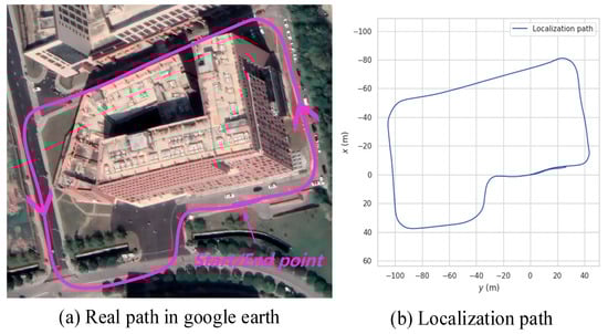 Figure 27 demonstrates the UGV’s outdoor localization performance during large-scale remote driving, validating the system’s ability to maintain accurate pose estimation in complex, unstructured environments. In subfigure (a), an overlay of the UGV’s ground truth path on Google Earth is shown, depicting the real-world trajectory around an academic building, including straight segments, turns, and looped sections. Subfigure (b) shows the estimated localization path generated by our system, showing near-complete alignment with the ground truth (deviation < 0.3 m RMS), enabled by semantic-aware loop closure and dynamic feature rejection. This alignment highlights two critical conclusions, as follows. (1) Cross-environment generalizability: The system maintains accuracy in outdoor scenarios with varying lighting and feature density, building on the indoor validation in scenarios 1–3 and extending the dual–channel architecture’s utility for long-range UGV operations. (2) Practical mission readiness: the 80 ms latency for MQTT telemetry and 42 ms WebRTC video feedback ensure real-time operator control, even during high-speed maneuvers, as evidenced by the smooth trajectory in Figure 27b.