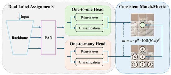 where p is classification score, and and b represent the predicted and true boundary box, respectively. s denotes the spatial prior indicating whether the predicted anchor is within the instance. and are two important hyperparameters that balance the effects of semantic prediction tasks and position regression tasks. Through consistent matching measures, the optimization direction of one head and one head are consistent, thereby enhancing the model’s performance.