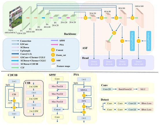 - Aiming at multiscale issues in UAV aerial images, we have improved the neck network using the ASF structure. This structure achieves comprehensive fusion of different scale features and enhances detection capability by optimizing the feature pyramid and the path aggregation network. Concurrently, adding a small object prediction head P2 into the head makes the model focus more on low-level features, thereby enhancing its sensitivity to small objects.